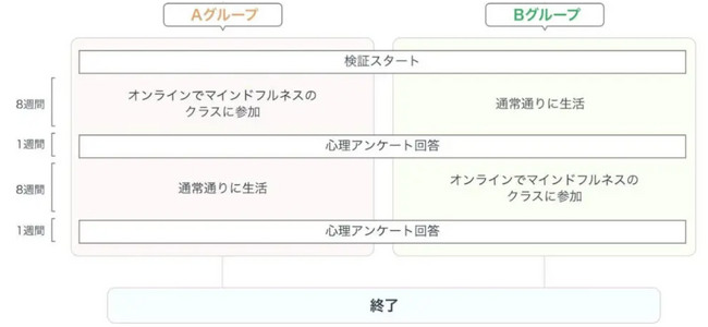 一方、グループBは8週間を通常通りに生活してから、2回目の心理アンケートに回答。その後、8週間のオンライン・マインドフルネスを実践した後に、3回目の心理アンケートに回答いただきました。