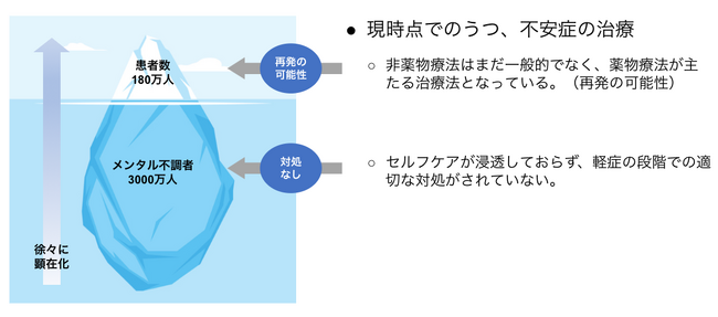 うつや不安症の治療方法は、薬による治療が一般的です。しかし、薬物治療は医師の指示なく服用を中断した場合、再発や慢性化が懸念されています。また、セルフケアが浸透しておらず、軽症の段階で適切な対処ができずに悪化してしまうことが多く見受けられます。