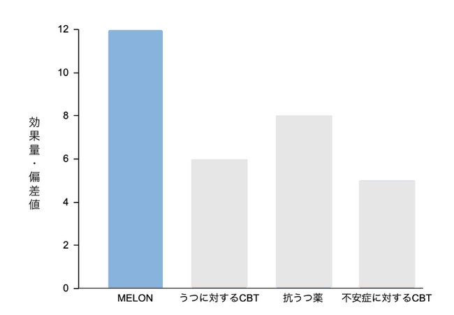 今回行った研究では、うつや不安症に対する改善効果として、MELONのオンライン・マインドフルネスは他の介入と比較して効果が大きいことを実証。他の介入効果と比較して、1.5倍以上の効果量・偏差値であることを確認しました。