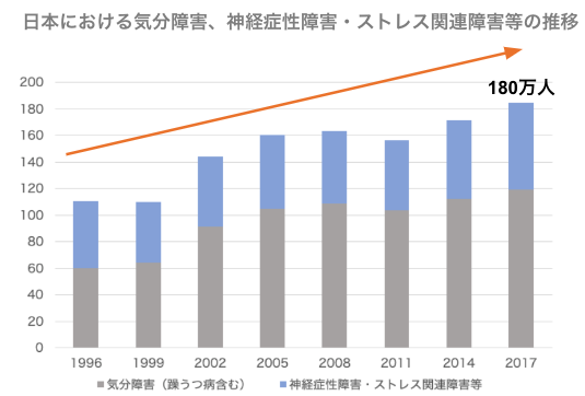 厚生労働省の調査によると、メンタルヘルス不調の悪化により引き起こされる精神疾患を抱える患者数は、過去15年間で年々増加しています。特に、昨今の新型コロナウイルス感染症や感染対策に伴う種々の行動制限やライフスタイルの急激な変化は、さらにメンタルヘルス不調の要因を多様化・複雑化させたと認識されています。