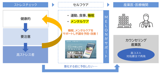 MELONのプログラムは、高ストレス者のメンタルヘルス対策はもちろん、要注意者、健康な方のセルフケアにも利用できるので、予防・未病やプレゼンティーイズム(生産性)の改善にも寄与します。