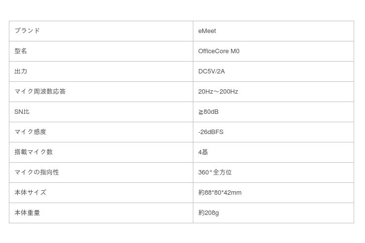 『eMeet OfficeCore M0 USBスピーカーフォン』は、最大10人までの中規模会議に適したマイクスピーカーです。エコーキャンセリング機能, ノイズキャンセリング機能に対応した4基のマイクを内蔵しており、360°全方位の声をクリアに拾上げて相手側に届けることができます。スピーカーの瞬間最大音量は80dBとなっており、相手側の声も明瞭に聞き取ることが可能です。