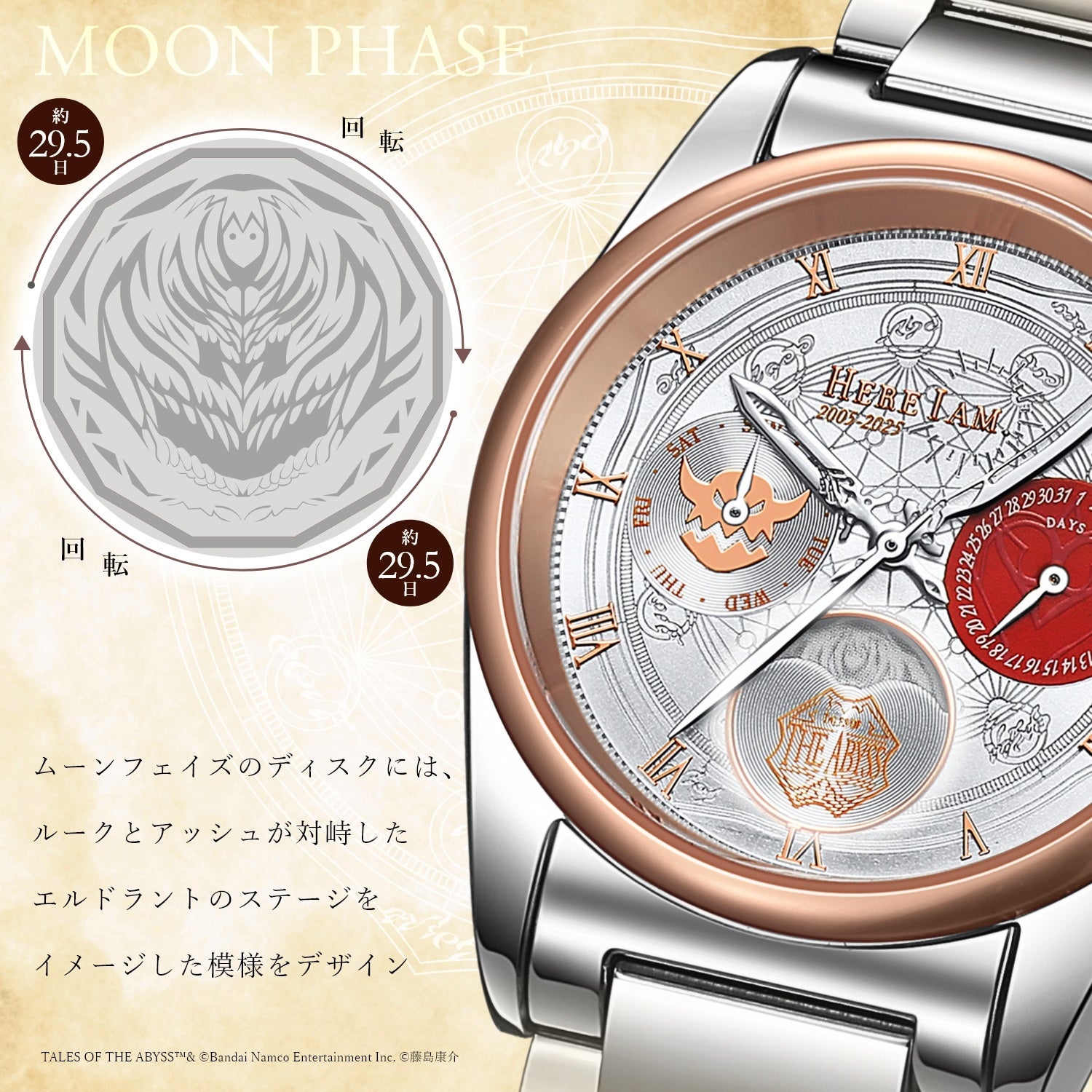 本モデルでは、そのムーンフェイズディスクに、ルークとアッシュが向かい合ったエルドラントのステージをイメージした模様をデザインしました。