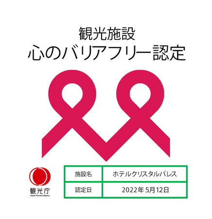 ホテルクリスタルパレスはバリアフリー対応や情報発信に積極的に取り組む姿勢のある観光施設を対象とした「観光施設における心のバリアフリー認定制度」の認定を得た宿泊施設です。ご高齢の方や障害のある方がより安全で快適な旅行をするための環境整備に努めております。