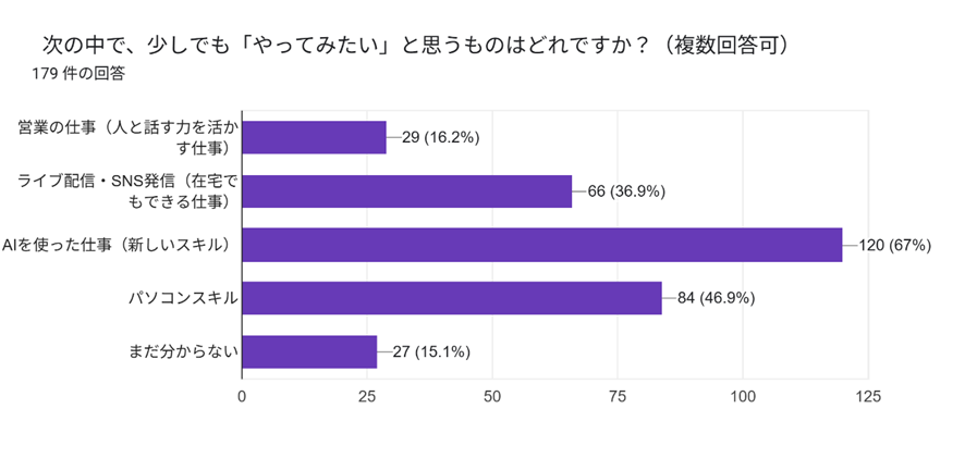 ・注目スキル: 「やってみたいと思うもの(複数回答可)」では、「AIを使った仕事」が67%で1位、次いで「パソコンスキル(46.9%)」、「ライブ配信・SNS発信(36.9%)」と続いています。