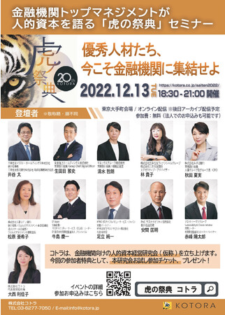 なお「虎の祭典2022」イベントでは、本研究会でのテーマも含め、金融業界における人的資本経営について金融業界のトップリーダーの方々にご登壇いただき議論をしていただくこととなっています。
