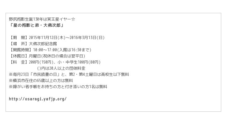 兄の野尻抱影は英文学者であり、天文民俗学者として独自の方法で“星の美”を語り続けました。弟の大佛次郎も、時代小説や開化小説の他「パリ燃ゆ」や「天皇の世紀」など幅広いジャンルで独自の世界を開拓した昭和を代表する作家です。