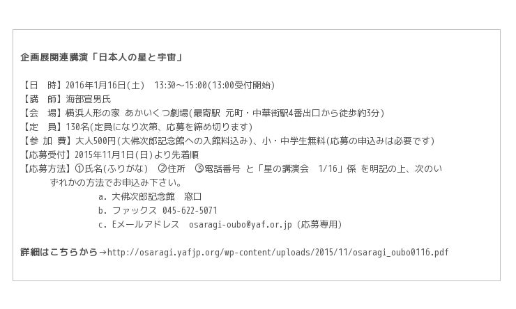 会期中には関連企画として、国立天文台名誉教授、国際天文学連合(IAU)顧問の海部宣男氏による講演会が開催されます。