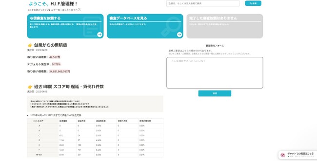 1. 企業データベースの閲覧 H.I.F.が過去に審査した企業とその与信データの一部を自由に閲覧いただけます。2. 審査依頼 調査したい企業がデータベースにない場合や、最新の審査を確認したい場合は、審査依頼画面から新たに審査を依頼していただくことができます。財務諸表は不要で、情報が少ない企業の審査もお受けしております。