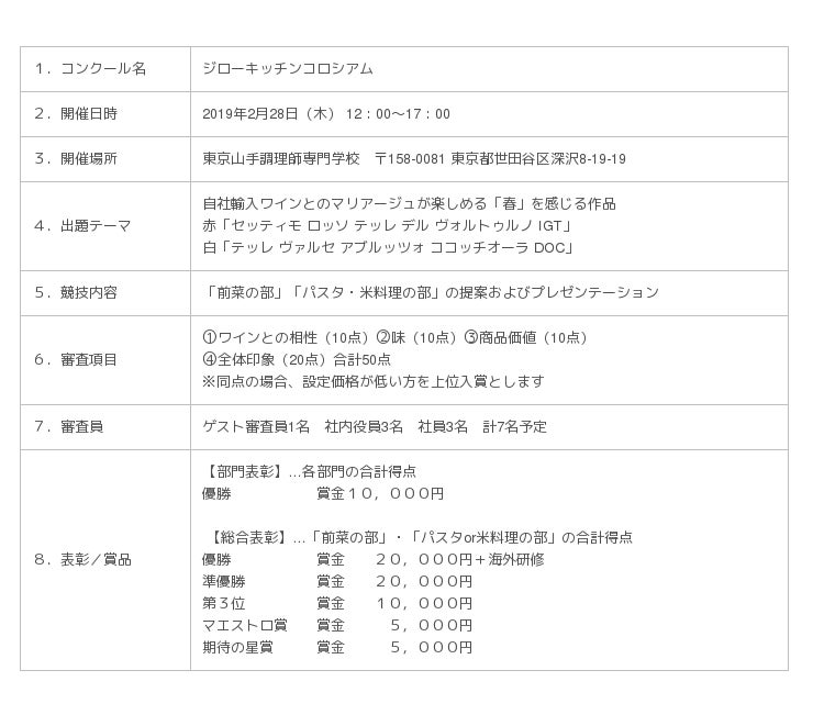 今年で13回目を迎えるジローキッチンコロシアムのテーマは、「自社輸入ワインとのマリアージュが楽しめる春を感じる作品」です。参加者は、社内公募を行いさらに部長推薦を受けた精鋭たちです。競技方法は、「前菜の部」「パスタor米料理の部」でそれぞれ1品ずつ、計2品で競い合い、部門表彰・総合表彰を行います。評価項目は、「ワインとの相性」、「味」、「商品価値(コストパフォーマンス・作業性)」、「全体印象」の4項目です。ワインは、自社輸入ワインの赤「セッティモ ロッソ テッレ デル ヴォルトゥルノ IGT」(イタリア/アロイス社)、白「テッレ ヴァルセ アブルッツォ ココッチオーラ DOC」(イタリア/フレンターナ社)の2種類から料理と相性の良いワインを提案します。