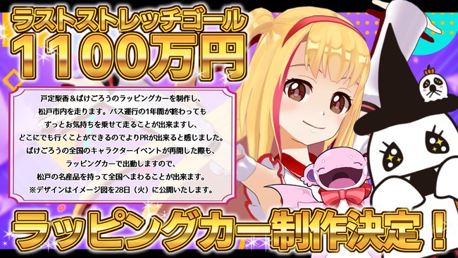 をそれぞれ達成し、最後のストレッチゴールとして、ラッピングカーの制作を行うことが発表された。