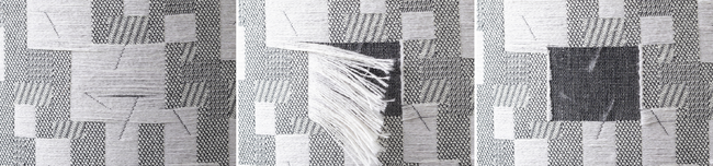 通常、カットジャガード生地の「毛束を裁断する工程」をせずに残したことにより、猫がひっかきやすい生地の構造を残しています。糸のほつれや、毛束の後ろの生地デザインが表面に現れることによって、オリジナリティある姿に変化していきます。