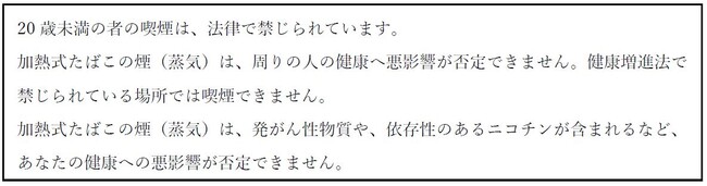 BATグループでは、たばこ製品のマーケティングを適切に実施するために国際的な自主規準を設定しています。そのため消費者に対するたばこ製品に関するすべてのコミュニケーションには、20歳未満の方へのコミュニケーションをお控えいただくとともに、「喫煙と健康に関する注意文言」を表示することを関係各位にお願いをしております。加熱式たばこに関しては、記事掲載していただく際には、「健康に関する注意文言」が表示されるようご配慮いただきたく存じます。 ご協力の程、何卒よろしくお願い申し上げます。
