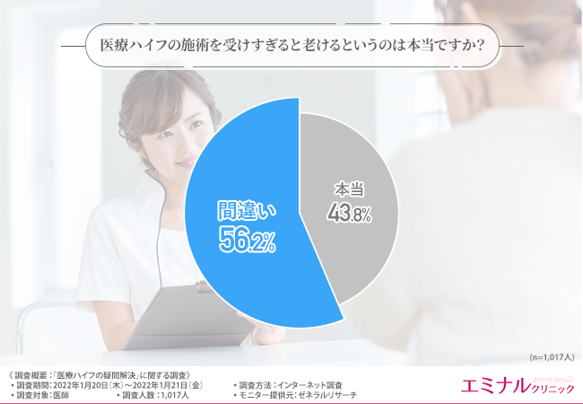 そこで今回、医療ハイフサービス(https://eminal-clinic.jp/hifu/?refmedia=A-40039)を提供する医療脱毛のエミナルクリニック(https://eminal-clinic.jp/)は、全国の医師を対象に、「医療ハイフの疑問解決」に関する調査を実施しました。