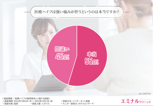 「医療ハイフは強い痛みが伴うというのは本当ですか?」と質問したところ、『本当(55.0%)』『間違い(45.0%)』と回答が割れる結果となりました。