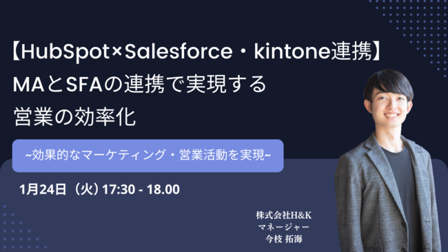 2023年1月24日(火)17:30~18:00でZOOMにて、「【HubSpot×Salesforce・kintone連携】MAとSFAの連携で実現する営業の効率化」について語るウェビナーを開催いたします。