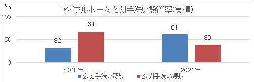 新型コロナウイルスの流行前と後で住まいにおける健康への意識に変化があったかどうか、当社で建築又は建築予定の方の間取りを調査しました。その結果、新型コロナウイルス感染拡大前の2018年と比較して、2021年に建築の方の間取りでは、「玄関手洗い=ただいま手洗い」の提案が約2倍の設置率60%超になっており、近年の新型コロナウイルス感染拡大を受け、この提案がお客様に受け入れられていることが調査から判明しました。