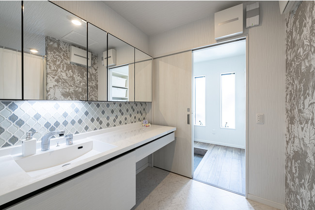 洗面脱衣室は、成長した姉妹が安心して使えるよう、壁で脱衣スペースと洗面スペースを分割しています。さらに、担当者の提案で、帰宅時に便利な“ただいま手洗い動線”も取り入れています。