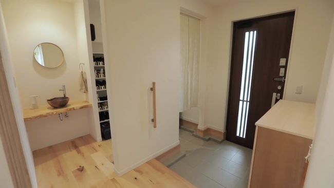 玄関をプライベート用、お客様用と分けて設置。プライベート用の入口から上がるとすぐに手洗い用の洗面台が設置されており、帰宅してすぐに手を洗うことができます。