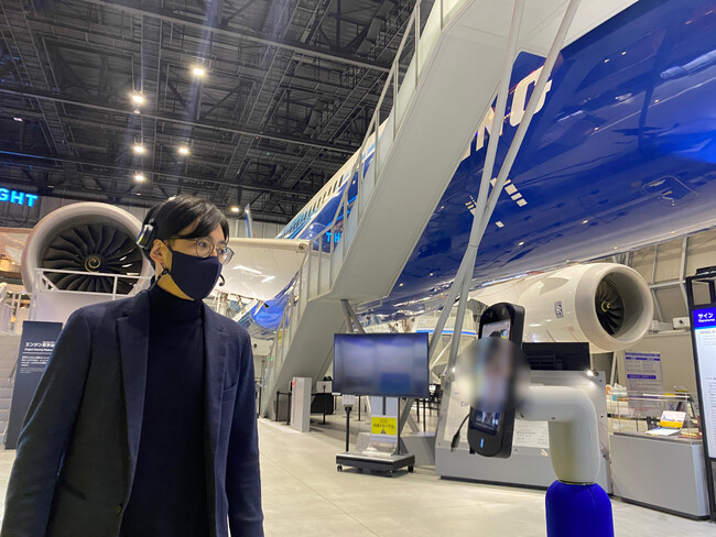 空港施設に設置された本物の航空機を、遠方の中学生がnewmeを通して遠隔で見学する実証実験を実施。