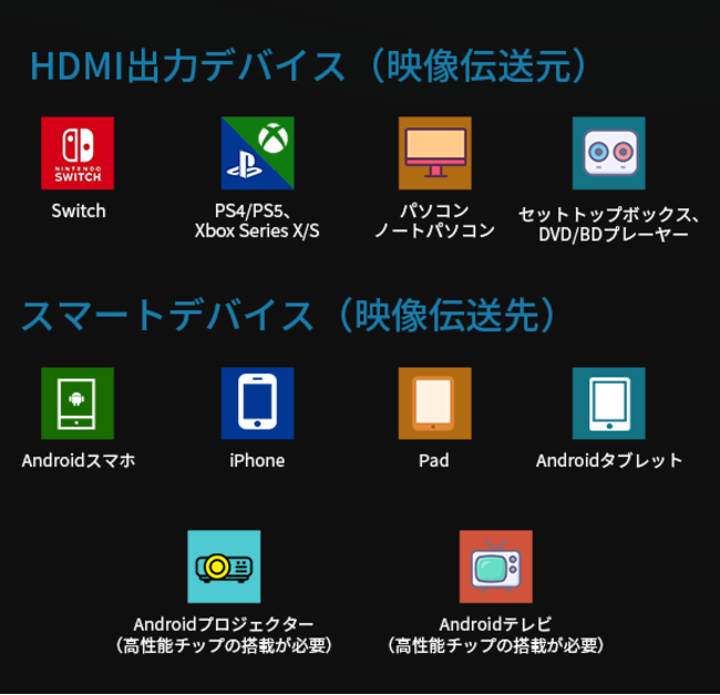 「KIIKUU」は幅広いデバイスに対応しています。伝送元として、ゲーム機などはもちろん、HDMI出力端子搭載の機械であれば、ほとんど伝送可能です!そして、伝送先について、スマホ・タブレットはもちろん、iOS 9.0以降・Android 8.0以降搭載のスマートデバイスであれば、HDMI信号の画面が映せます。