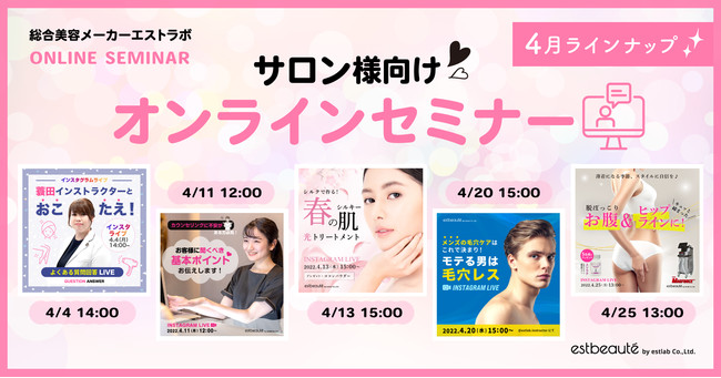 すべての人に「美」と「健康」の提供を目指し、化粧品や美容機器を製造する株式会社エストラボ(本社:東京都新宿区、代表取締役社長:久保瞳)は、エステサロン様向けの無料オンラインセミナーに関して、4月の開催情報を公開いたしましたので、ご案内申し上げます。