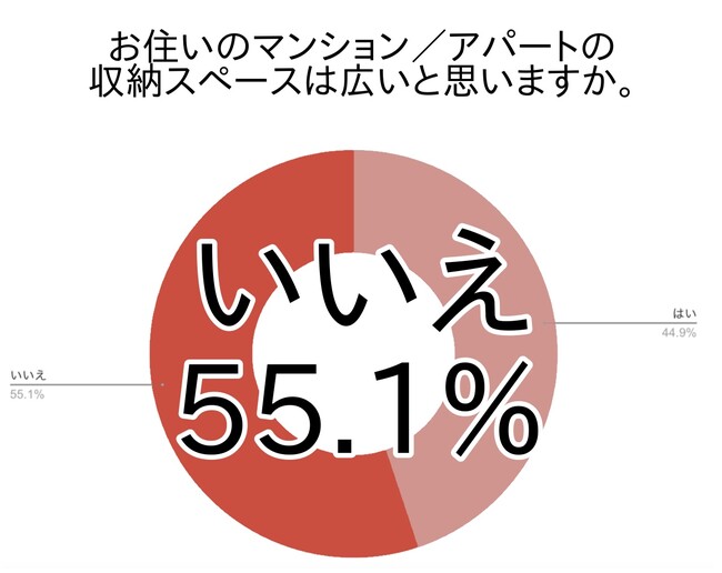 今回のアンケートでは6割弱(55.1%)の方が自宅の収納スペースを広いと感じていないと答えました。広いと感じている方のほうが少なく、44.9%でした。
