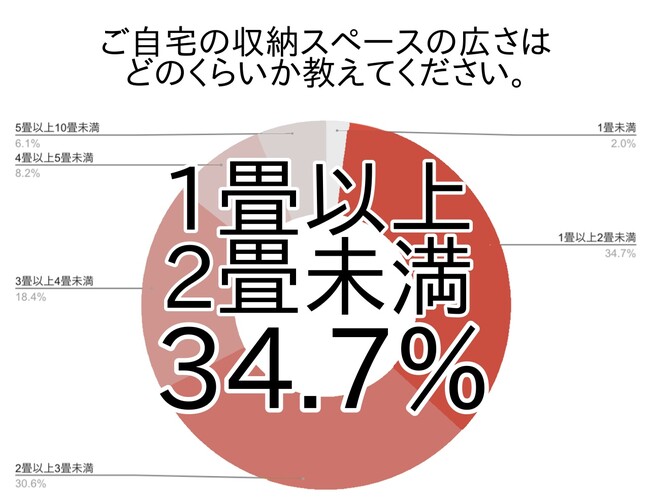 最も多かったのは「1畳以上2畳未満(34.7%)」で、次に多い「2畳以上3畳未満(30.6%)」と「1畳未満(2.0%)」と合わせて3畳未満が7割弱(66.3%)であることが分かりました。