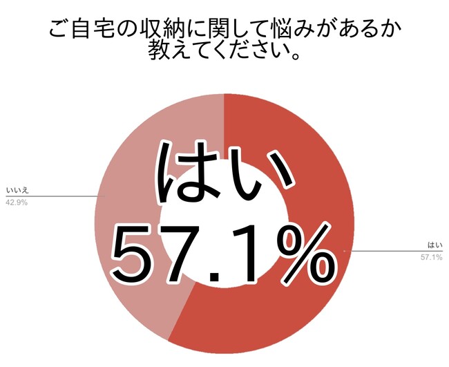 アンケートでは自宅収納に悩みがあると答えた方が6割弱(57.1%)でした。最初の質問で自宅収納が広くないと感じていたのが55.1%であることと照らし合わせてもわかるように、収納スペースの広さが足りないことが収納の悩みに直結している傾向をよく表しています。