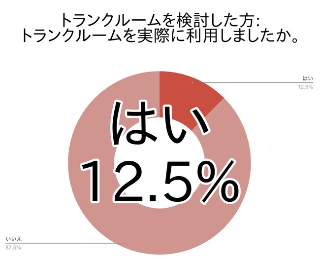 アンケートでは、12.5%の方がトランクルームを実際に利用したことが分かりました。これは、収納の悩みがある方の割合やトランクルームの利用を検討した方の割合と比較すると少ない数字であると言えるでしょう。