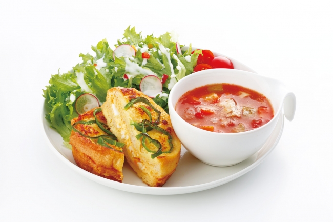 ふわふわに焼き上げた、たまごサンドのフレンチトーストと、具沢山の ミネストローネを合わせた、見た目も楽しいお食事にぴったりのメニューです。