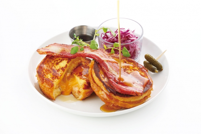 Ivorishがおススメする、アメリカンなフレンチトースト! ツナとチェダーチーズをサンドしたフレンチトーストに メープルシロップをたっぷりかけて、旨味たっぷりの ホエー豚のベーコンと一緒にお召し上がりください。 甘さとしょっぱさが絶妙にマッチする驚きのメニューです。