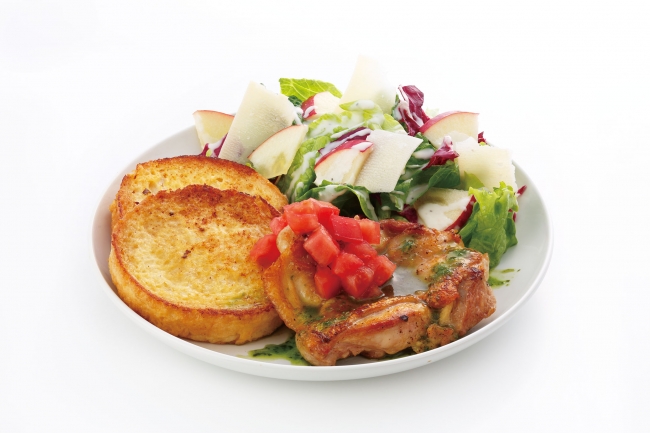 食欲をそそるバジルの香りがたまらないグリルチキンと,リンゴとパルメザンチーズのシーザーサラダがついたボリューム満点な一皿です。※写真はフレンチトースト2枚です。