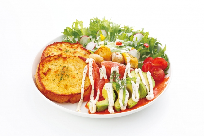 スモークサーモントラウトと相性抜群のアボカドの組み合わせに、ディル、粒マスタード、ハチミツを混ぜ合わせたディルマヨネーズソースをかけました。付け合わせのアンデスポテトと共にフレンチトーストをお楽しみください。※写真はフレンチトースト2枚です。