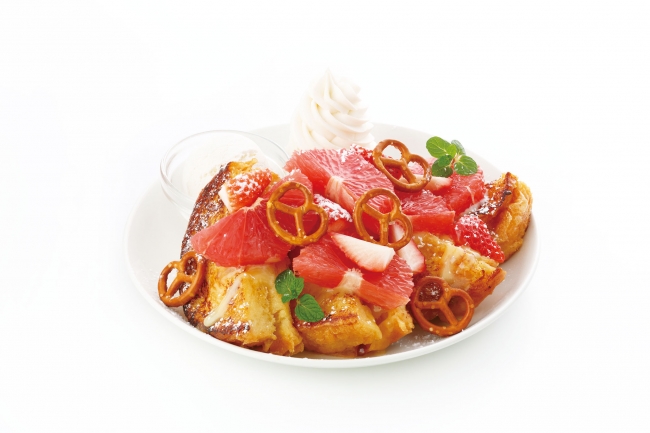 ハチミツと柑橘系の甘酸っぱい爽やかなフレンチトーストが出来ました。 ハニーメープルをサンドし焼き上げたフレンチトーストに、レモンクリーム、 ピンクグレープフルーツ、イチゴ、味のアクセントにプレッツェルを飾りました。※写真はレギュラーサイズです。