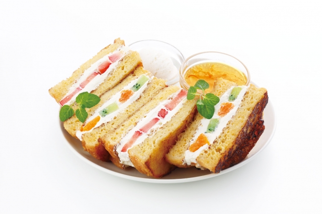 フレンチトーストでできた、カラフルでボリュームたっぷりのフルーツサンドです。 優しいケーキのような味わいで、お子様から幅広くお楽しみいただけます。 *ハーフサイズの場合は、キウイとオレンジのみになります。