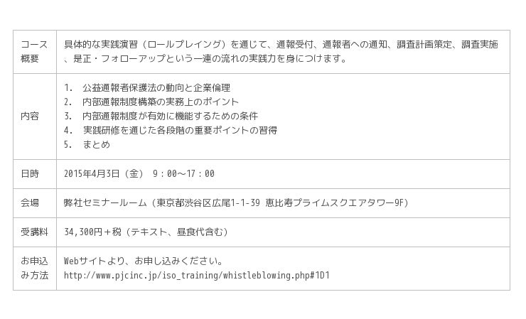 ペリージョンソン ホールディング 株式会社(本社:東京都渋谷区、社長:瀬戸裕子、以下:PJHD)でビジネスコンサルティング事業を担う ペリージョンソン コンサルティング(以下:PJC、http://www.pjcinc.jp)は、演習を通して内部通報の効果的な運用方法を身につける実践セミナー「内部通報管理者徹底事例演習1日コース(上級)」(http://www.pjcinc.jp/iso_training/whistleblowing.php#1D1)を4月3日に開催します。