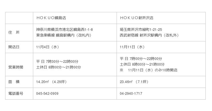 小田急グループでパンの製造・販売を行っている株式会社北欧トーキョー(本社:神奈川県座間市 社長:宇佐美 淳 店舗名:「HOKUO」)では、2015年11月4日(水)に「綱島店」、11月11日(水)に「新所沢店」をオープンします。これは東急東横線、西武新宿線の駅構内への初出店となります。