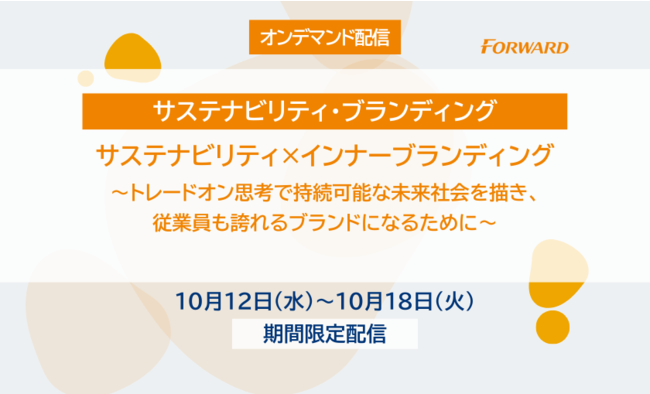 企業のブランド戦略を支援する株式会社フォワード(本社:東京都中央区、代表取締役:伊佐 陽介)は、「サステナビリティ×インナーブランディング 〜トレードオン思考で持続可能な未来社会を描き、従業員も誇れるブランドになるために〜」のオンデマンド配信を実施致します。2022年10月12日 (水)〜18日 (火) の期間限定配信となっております。