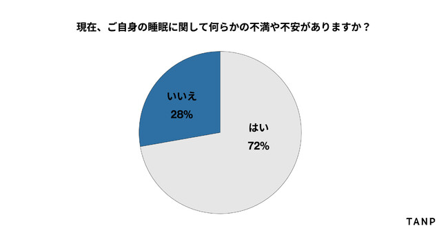 私たちの人生の約3分の1にも相当する睡眠時間ですが、本アンケートの「現在、ご自身の睡眠に関して何らかの不満や不安がありますか?」という設問では、7割を超える回答者から「不満・不安がある」の回答が集まりました。