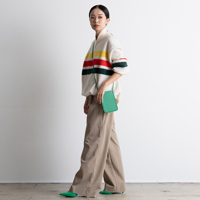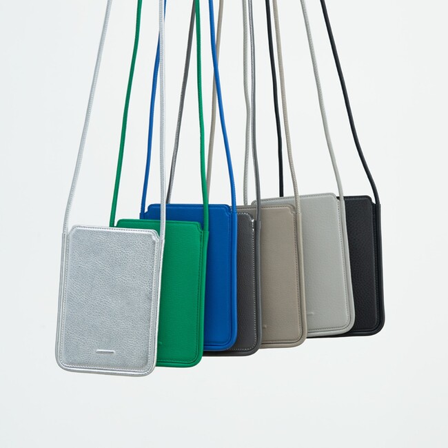 ウォレットバッグのマチ幅を拡張したボックスシルエットによってハンドサニタイザーやワイヤレスイヤホンといった厚みのあるアイテムに対応。胴体部分の2本のパイピングが底鋲の役割として、自立する安定感を高めています。背面には、3つのカードスロット、紙幣・硬貨・鍵を収納可能なファスナー式のポケットを装備。半日程度の外出に欠かせないアイテムをまとめて収納可能です。カラーバリエーションは、ブラック・ホワイトベージュ・グレー・オフホワイト・トープに新色としてラピスブルー・ジョリーグリーン・シルバーを加えた8色で展開します。