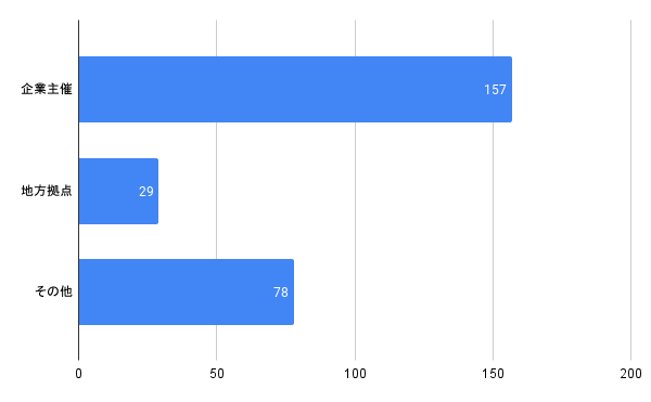そこで本総研では、100名以上の登録があり、半年以内に活動が実施されたコミュニティについて調査を実施いたしました。調査した団体を主催元別(企業主催、地方拠点、その他)に分け、各団体の特徴についてご紹介します。