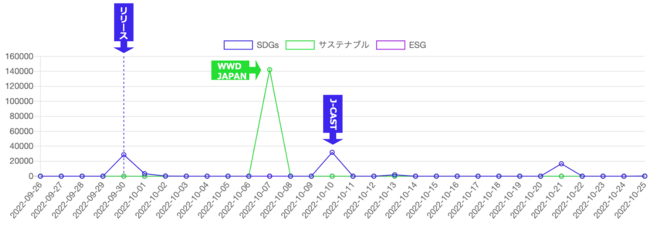 記事の数で見ると、9月30日のプレスリリースと10月10日の『J-CASTトレンド』とその転載記事が目立ちます。しかし仮想PVでは『Yahoo!ニュース』への転載が高い数字を得た『WWD JAPAN』の記事が際立ちます。ただし、『WWD JAPAN』の記事内容は食品ロスではなく、キッザニアで開催中のイベント「未来を変える!アクションラリー」についてです。