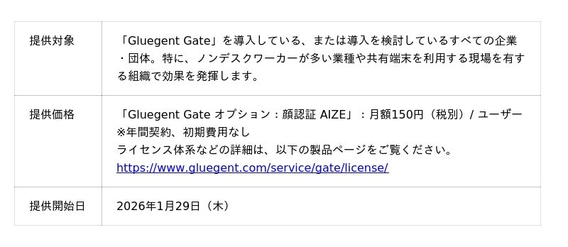 サイオステクノロジー株式会社(本社:東京都港区、代表取締役社長:喜多 伸夫、以下、サイオステクノロジー)と株式会社トリプルアイズ(本社:東京都港区、代表取締役:片渕 博哉、東京証券取引所グロース市場:5026、以下、トリプルアイズ)は、サイオステクノロジーが提供するIDaaS(Identity as a Service)ソリューション「Gluegent Gate」において、トリプルアイズが提供する顔認証AI「AIZE(アイズ)」を新たなオプション機能として2026年1月29日より提供開始することを発表します。