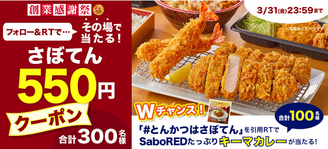 「とんかつ新宿さぼてん」(運営:株式会社グリーンハウスフーズ)は、公式 Twitter アカウントにて「とんかつ新宿さぼてん 55周年創業感謝祭Twitterプレゼントキャンペーン」を3月1日(水)から3月31日(金)まで実施します。公式Twitterアカウントをフォローし、対象のツイートをリツイートされた方の中から抽選で300名様に、全国のさぼてんレストラン・デリカ店舗でご利用いただけるデジタルクーポン「さぼてん550円クーポン」をプレゼント。はずれでもさらに抽選で100名様に、さぼてん人気メニューをプレゼントします。