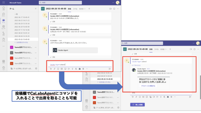 また、先生がTeams bot(特定のタスクを入力すると自動で実行するアプリケーション)の投稿欄に出席を取るためのコマンドを入力することでも出欠確認が可能です。
