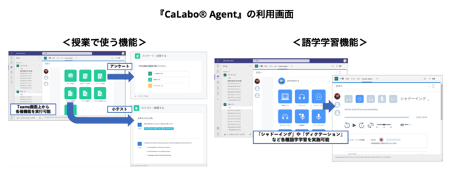 『CaLabo(R)? Agent』アプリはマルチテナント版の『CaLabo(R) MX』でご利用いただくことができ(注2)、Teams のチャネル上にタブとして表示されます。? Teams を利用されている場合、Teams の画面上から『CaLabo(R)? MX』の機能を操作できるため、ウィンドウを切り替えることなく1つのアプリ内でシームレスに操作でき、利便性が向上します。チャネルタブ上には「授業を開始」「出席」「アンケート」「評価シート」など先生が授業で使う機能のほか、生徒側が使用する「Webテレコ」「シャドーイング」「ディクテーション」など語学学習機能が搭載されています。シャドーイング機能にはAzure Cognitive Services の Speech to Text を採用し、生徒の発話がそのままテキスト化され、モデル音声と比較して自動採点されます。自分の発音を視覚的にも確認できるため、練習の成果を実感しやすく、モチベーション向上にも役立ちます。