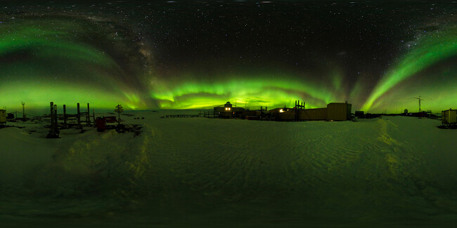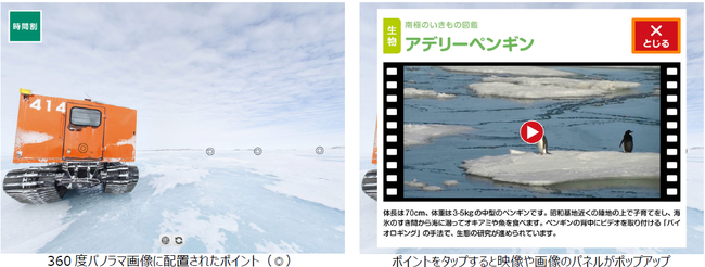「南極e スクール」では、南極に関する話題を、地理・歴史・生活・生物・地学・宇宙の6 分野に分けて紹介しています。それぞれの分野で紹介される360 度パノラマ画像が、使用するデバイスに内蔵されるモーションセンサーと連動※2。手にしたデバイスの動きに合わせて画像が動き、まるでその場に居るかのような感覚で南極の景?を楽しむことができます。また、360 度パノラマ画像に配置されたポイントをタップすることで、南極に生息する動物たち、太陽が沈まない?夜、隊員が生活する昭和基地内部の様子などに関するパネルがポップアップ。極地研の研究者が監修した解説とともに、それぞれの分野に関する貴重な映像、画像を見ることができます。