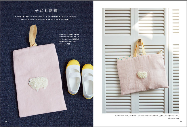 子どもの持ち物には、使いやすさと子どもの小さなサイズを考えてワンポイントの図案に。こんなかわいい刺繍なら忘れ物もなくなりそうです。上履き入れ、レッスンバッグ、お弁当袋、巾着リュックサック、スタイなど。どれもシンプルな仕立てで作りやすいので安心です。お気に入りの入園・入学グッズを作ってみてくださいね。