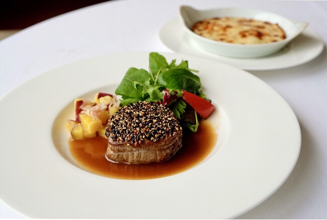 ビールミール(ビール酵母)入りの発酵飼料で長期飼育した高知県の「四万十麦酒牛」はジューシーな口当たり、しっかりとした肉の味、さっぱりとしたあと味が特徴。この「四万十麦酒牛」のフィレ肉にたっぷりの黒胡椒をのせて、スパイシーなアクセントを付けました。付け合わせは、色鮮やかな旬の野菜と甘みが凝縮されたサツマイモを。
